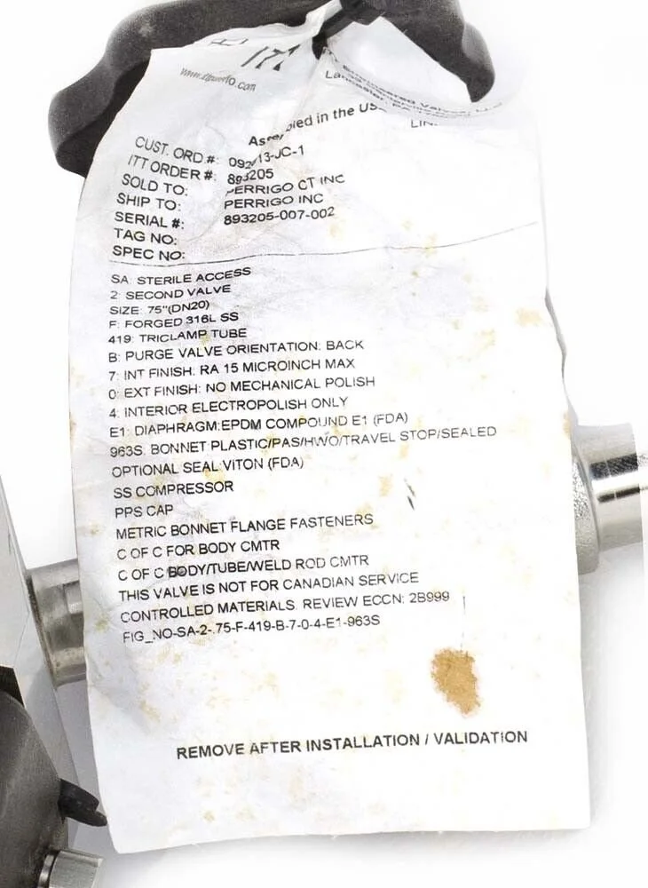 Categories: All Large Equipment Gas Regulators Sensors and Probes Process Equipment Motors Drives Transmitters Controls and Indicators Cable and Wire Electronic Components Power Supply Contactors Fuses and Relays Switches and Disconnects Lab Equipment PLC Modules and HMI Modules HMI Allen Bradley Modules HMI Buttons and Switches Contactors and Relays PLC Cards Valves Pressure Relief Valves Actuators Bonnets Solenoid Valves Butterfly Valves Diaphragm Valves Ball Valves Pumps Valves Pressure Relief Valves | Actuators | Bonnets | Solenoid Valves | Butterfly Valves | Diaphragm Valves | Ball Valves | SMC SS5Y5-45FD-04D-N7 Manifold Base w/ Four SY5140-5FU & 24VDC Comm Connector $115.00 SMC SS5V1-16FD1-05U-C6 Pneumatic Manifold Assembly Block with SV1A00-5FUD (5X) $125.00 PBM Pneumatic Rack and Pinion Spring Return Actuator PAVCL453S--0075 $200.00 PBM Pneumatic Rack and Pinion Spring Return Actuator PAVCL453S--0052 $140.00 NovAseptic NA76/150 Manual Actuator With Certificate ASTM 303 Stainless Steel $550.00 Sold Out Inline Pneumatic Actuator AP-SR-63-B-N 116 psi $150.00 Habonim TuBore 316L Stainless Steel 2" Sanitary Ball Valve Body $175.00 Sold Out GEMU Pneumatic Dual Diaphragm Valve 3/4" Tri Clamp w/ 3/4" NPT Sample Port $300.00 GEMU Pneumatic Dual Diaphragm Valve 3/4" Tri Clamp w/ 1/2" NPT Sample Port $300.00 GEA Varivent Hygenic Valve 2" Upper Housing 1.5" Lower Housing Welded Seat Ring $450.00 GEA Varivent Hygenic Valve 1.5" Upper Housing 1.5" Lower Welded Seat Ring $450.00 GEA Varivent Hygenic Valve 1.5" Upper Housing 1.5" Lower Welded Seat Ring $450.00 Flo-Tite 3" 316L CF3M SS 1000 WOG S300 Series Ball Valve Tri Clamp $300.00 Flo-Tite 3" 316L CF3M SS 1000 WOG Actuated Ball Valve Tri Clamp $500.00 Flo-Tite 2" 316L CF3M SS 1500 WOG Actuated Ball Valve Tri Clamp $350.00 Flo-Tite 2" 316L CF3M SS 1500 WOG Actuated Ball Valve Tri Clamp $250.00 FESTO VIGM-03-7,0 18742 Manifold Connector Block $20.00 Festo MTH-5/2-7,0-L-S-VI 151700 Solenoid Valve $35.00 FESTO CPV10-VI 6 Valve Pneumatic Solenoid Block $80.00 FESTO CPV10 Valve Manifold 4 Block 2 Solenoid Valves 161416 $75.00 FESTO 8 Valve Block 161362R202 and 161362R102 $200.00 Dixon Valve 3" CF8M SS 1000 WOG Ball Valve Tri Clamp $200.00 CKD Valve 3GB2669R-00-A2NHE-3 16 Valve Solenoid Block $200.00 Box of 20 Used PISCO BVC20-1/4-N2U Ball Valves $80.00 Belimo TR24-3-T Valve Acuator with 1/2" B210B Valve $90.00 Assured Automation 3/8" Brass High Pressure Pneumatic Coax Valve 3 Way 2 Posi... $250.00 ASCO Red Hat WBIS8316A382V/WBIS8003A300 Stainles Steel 3/8 3 Way Solenoid Valve $250.00 ASCO Red Hat II Solenoid Valve Rebuild Kit No. 302925 1/4" Pipe $60.00 ASCO Red Hat II Solenoid Valve Rebuild Kit No. 123670 1/4" Pipe $60.00 ASCO Red Hat II Solenoid Valve EF8003G1 3/8" Pipe $75.00 ASCO Red Hat II 238210-032D 8262G6 Solenoid Valve: 1/8" Pipe $20.00 Aquasyn 316L Stainless Steel 1.5" Manual Valve Bonnet $30.00 Aquasyn 316L Stainless Steel 1" Manual Valve Bonnet $30.00 Allen Bradley 1771-OW Selectable Contact Output Module $70.00 Sold Out 6" 316L Stainless Steel Pneumatic Actuated Butterfly Valve Tri Clover, Inc. $400.00 4" 316L Stainless Steel Pneumatic Actuated Butterfly Valve Tri Clover, Inc. $200.00 4" 316L Stainless Steel Pneumatic Actuated Butterfly Valve Tri Clover, Inc. $200.00 3" 316L Stainless Steel Pneumatic Actuated Butterfly Valve Tri Clover, Inc. T... $125.00 3" 316L Stainless Steel Pneumatic Actuated Butterfly Valve Tri Clover, Inc. $125.00 2.5" CF8M SS 1000 WOG Actuated Ball Valve Tri Clamp $200.00 2.5" 316L Stainless Steel Pneumatic Actuated Butterfly Valve Tri Clover, Inc. $150.00 2" 316L Stainless Steel Pneumatic Actuated Butterfly Valve Tri Clover, Inc. $150.00 1.5" CF8M SS 1000 WOG Actuated Ball Valve Tri Clamp $200.00 1.5" CF8M SS 1000 WOG Actuated Ball Valve Tri Clamp $200.00 1.5" CF8M SS 1000 WOG Actuated Ball Valve Tri Clamp $175.00 1.5" 316L Stainless Steel Pneumatic Actuated Butterfly Valve Tri Clover, Inc. $125.00 SPIRAX SARCO DCV3-DN20 Check Valve Disk Assembly New in Box $50.00 Worcester Controls Series 40 Model 10 Acuator With 1/2" Ball Valve Buttweld &... $399.00 Sold Out Tour Andersson STAG Balancing Valve 4" ASTM 60-40-18 GROOVED $250.00 Sold Out Westlock Controls 99P2 Valve Position Monitor 99P21A00000 $150.00 Sold Out Swagelok 316L BPE SFV4 SS Point of Use Valve 1" Sanitary Connections Hose Barb $200.00 Waukesha Cherry-Burrell W81T 1" Sanitary Shutoff Valve 316L SS Steam Trace $900.00 Waukesha Cherry-Burrell W81T 1" Sanitary Shutoff Valve 316L SS Steam Trace $900.00 SVF 1" 316L Stainless Steel Ball Valve Sanitary Tri Clamp $60.00 PISCO BVC60-3/8-N2U 150psi Quick-Fitting Shut-off Ball Valve NPT 1/4 $20.00 Numatics 10 Solenoid Valves L01SA459O013A30 150 PSIG-AIR on Block $250.00 Sold Out QSM Tru-Flow 1.5" CF8M SS 1000 WOG Actuated Ball Valve Tri Clamp $200.00 QSM Tru-Flow 2.5" CF8M SS 1000 WOG Actuated Ball Valve Tri Clamp $450.00 QSM Tru-Flow 3" CF8M SS 1000 WOG Actuated Ball Valve Tri Clamp $450.00 QSM Tru-Flow 3" CF8M SS 1000 WOG Actuated Ball Valve Tri Clamp $600.00 Sold Out SMC Solenoid Valve VQZ332-5M-C6 0.15-0.7MPa $15.00 SMC NVFS2110-5DZ Solenoid Valve 0.1-1.0MPa Supply 15-145PSI $20.00 Proportion Air PSR-4 Pressure Regulator w/ QB1TFEE100 Pilot Valve Regulator $120.00 Sold Out Parker SWB Series 1/2" Two Way Ball Valve $99.00 SMC 5 Valve Solenoid Block (2) SV2A00-5FUD, (2) SV2B00-5FUD, (1) SV2C00-5FUD $200.00 SMC Solenoid Block 11 Valves SV1A00K0-5FUD $200.00 SMC Solenoid Block 10 Valves SV1A00K0-5FUD $200.00 SMC Solenoid Block 3 Valves SV1A00K0-5FUD $60.00 Parker Stainless Solenoid Valve 71315SN2GNJ1N0S100P3 1/8" NPT 3-Way NC 120 Volt $80.00 ITT 1/2" 316L Stainless Steel Sanitary Butt Weld Diaphragm Valve $50.00 Leser Type 483 1" Spring Loaded Clean Service 316L SS Safety Relief Valve $1,100.00 Sold Out Kunkle 911B Stainless Steel 1/2" Pressure Release Valve $300.00 ITT Dia-Flo Actuator Corrosion Resistant DI White Epoxy Coating for 1.5" Valve $400.00 ITT Dia-Flo Actuated 2" Valve Corrosion Resistant DI White Ep